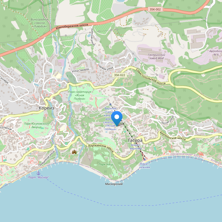 Отель расположен в живописном городке Гаспра на Южном берегу Крыма. Вокруг отеля растет можжевеловая роща, аромат которой благотворно влияет на нервную систему, способствует расслаблению и глубокому отдыху. Недалеко от отеля расположены самые красивые достопримечательности Крыма, такие как Воронцовский. Юсуповский и Ливадийский дворцы, а также Ласточкино гнездо. Оборудованный галечный пляж находится в 300 м.