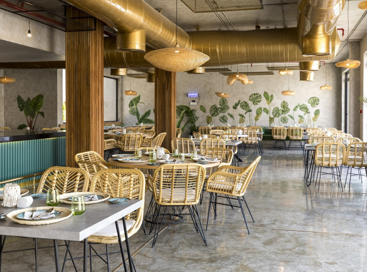 Дизайнерский пляжный бар-ресторан для гостей отель, сервирует напитки и закуски в течении дня