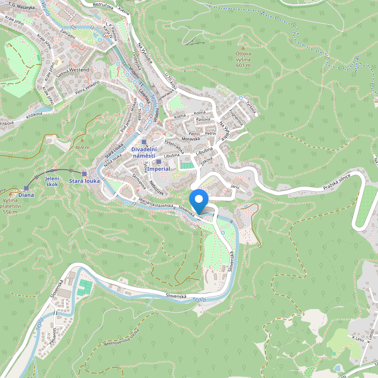 Отель расположен в курортном городе Карловы Вары, в районе Стара Лука, недалеко от центра города.