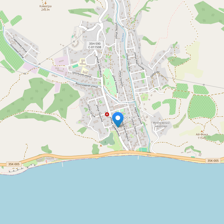 - Собственный песчано-галечный пляж пансионата с навесами и лежаками расположен в 400 м от его территории.
