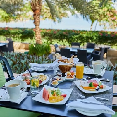 На курорте есть 3 ресторана, предлагающих самые изысканные кулинарные возможности в сочетании с лучшими видами на Оманский залив. Ресторан Mydan специализируется на интернациональной кухне , а ресторан Azure предлагает гостям самые чистые вкусы Средиземноморья вместе с лучшим выбором морепродуктов .