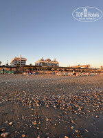 Красивый песчаный пляж, галька и камни имеется при входе в воду. Справа есть перила, что бы было удобней заходить и вот вход рядом с ними и по центру от деревянного настила, вход удачный, пару шагов и песок. В море плиты и камни, нужно быть осторожными! А так море прекрасно, теплое, чуть дальше отплывете от берега и красота 😍