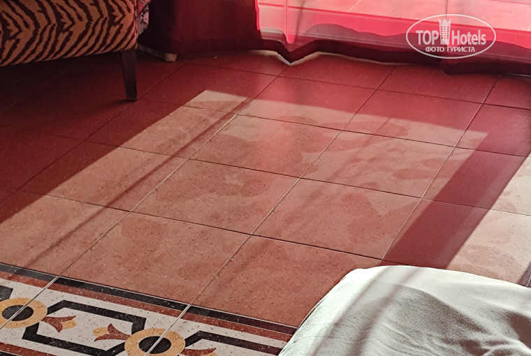 2. Номера. Специально брали Харем, большие, удобные номера, большая ванная комната, удобный балкон. Холодильник, кондиционер, телевизор работали, никаких нареканий. Кровати удобные, хотя бельё не совсем новое, часто с катышками. Негатив - обслуживание номера. Что, по-моему мнению, должен сделать обслуживающий персонал: 1. прибрать постель, заменить бельё (с положенной частотой), 2. вымыть кружки-чашки, 3. вымыть/пропылесосить пол во всём номере, вытереть пыль на мебели, 4. принести воду в положенном количестве, 5. поменять полотенца, принести умывальные принадлежности (шампунь, гель, мыло). Все пять пунктов должны быть в инструкции по обслуживанию, выполнение можно попунктно проверить менеджеру среднего звена. В реальности выполняются только пункты 1, 2 и 4. Полотенца меняли, но иногда приходилось указывать, что нужно поменять ножное полотенце возде душа или что бежит вода из арматуры унитаза и лужу пришлось вытирать чем придётся и это чем придётся тоже нужно поменять. Полы не мылись совсем, пыль не вытиралась тоже (подтверждение - на фото).