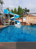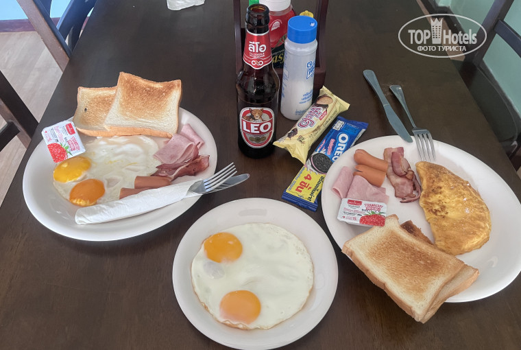 Отдыхали в этом отеле 2 недели. Отель очень старый, требует ремонта. Мебель и сантехника старая. Постельное белье и полотенца в номере белые без пятен, постельное меняли раза 4 точно. Полотенца выдают только большие для душа. Территория небольшая, но уютная. Народу очень мало. Кажется, что кроме нас никого нет. Отдыхают в основном европейцы с тайками, на выходные приезжают тайцы семьями, тогда жизнь начинает кипеть возле бассейна. До моря далековато, идти в обход минут 15 точно сначала по территории рядом со стройкой, потом по проезжей улице вдоль кафешек и мимо магазинчиков. Пляж в районе отеля Лонг бич. Пляжные полотенца у отеля тоже старенькие. Завтраки за 100 батов есть на фото, если с кофе из кофемашины - 150 батов. Номер Люкс у нас состоял из гостиной, двух спален, зоны кухни и санузла. Есть выход к бассейну и на задний дворик с парковкой, там сушилка для белья. Кондиционеры в спальнях, в гостиной стоит вентилятор. В номере есть сейф, хороший фен, чайник, холодильник большой, из посуды - стаканы, кофейные чашки и блюдца. По заезду в холодильнике стоял набор из газировки, пива и прочего. На холодильнике висела табличка с ценами. Мы ничего не трогали, оставили как есть. Депозит у отеля - 1000 батов. Его вернули при выселении. Бассейн на территории хороший - небольшой, теплый, есть джакузи и водная горка. За такую цену отель, конечно, не плох, но для очень непридирчивых гостей))) Уборка проводилась каждый день, бумагу туалетную и воду питьевую пополняли ежедневно. Очень хорошая транспортная развязка - до улицы Наклыа с тук-туками всего 3-5 минут ходьбы. Рядом в отеле Грин бич есть прачечная. Стирка стоит 30-40 батов в зависимости от выбора машины. Для стиральной машины нужны 10 батовые монеты.